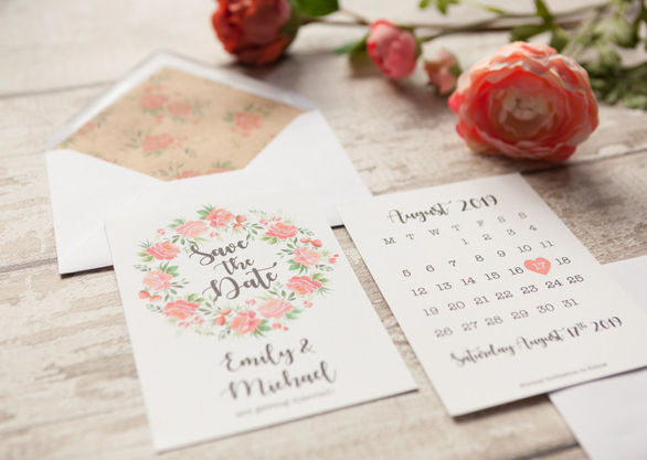 A cute postcard with ‘Save the Date’ encompassed by a pretty floral wreath design on the front. Your wedding date is highlighted on the month calendar on the reverse with a coral pink heart.
